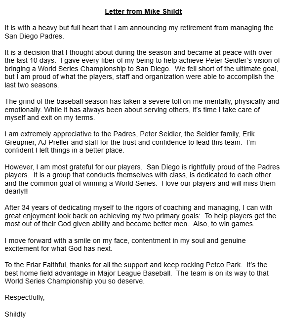 According to Acee, "Shildt and two Padres sources said that the decision to retire was Shildt’s alone."